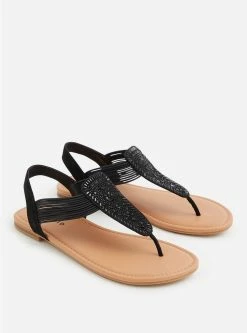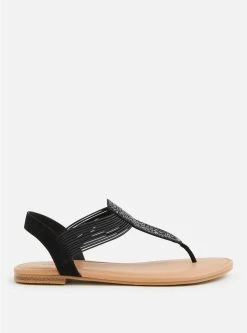 These T-strap sandals go with everything, featuring comfy ankle straps, cage strap detailing, and a glitzy faux stone design.