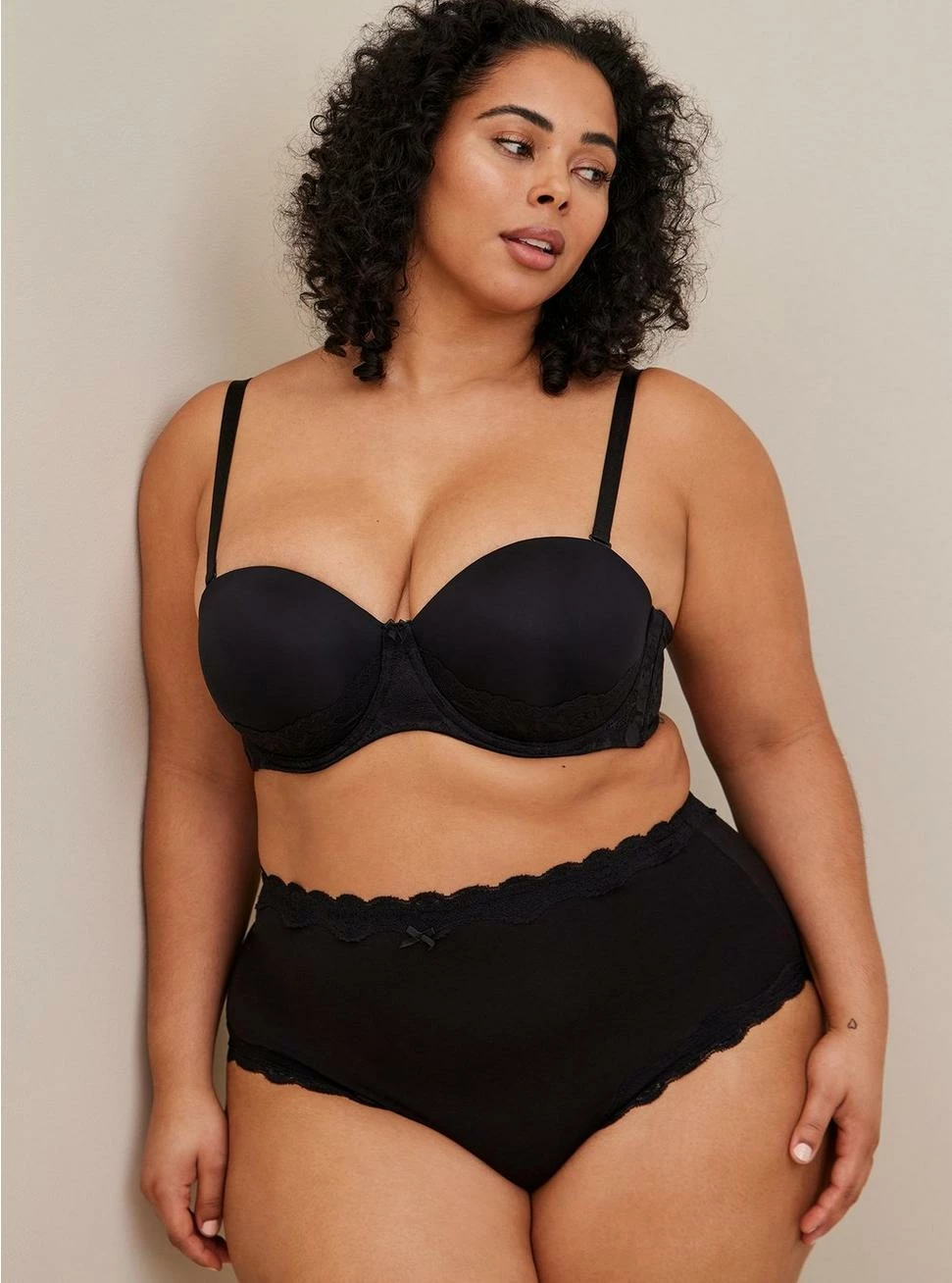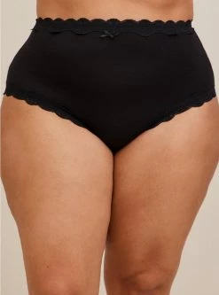 Black lace frames a soft and stretchy cotton panty that has a flattering high waist fit without sacrificing comfort.